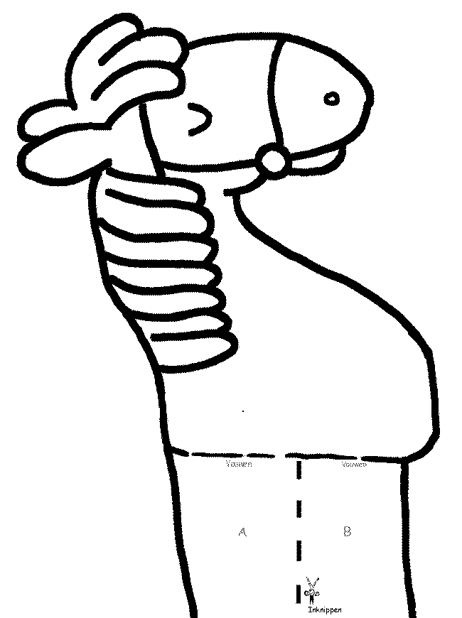 Nu ga je het paard kleuren, verven, etc. Daarna knip je het uit. De stippellijn waar het schaartje bij staat knip je ook in. Deel A vouw je naar links en deel B naar rechts. Daarna smeer je er lijm op en dan bevestig je de twee delen op het lange strook papier. Als je het paard erop hebt geplakt niet je beide einden van de strook aan elkaar vast (eerst de omtrek van je hoofd met het papier meten).